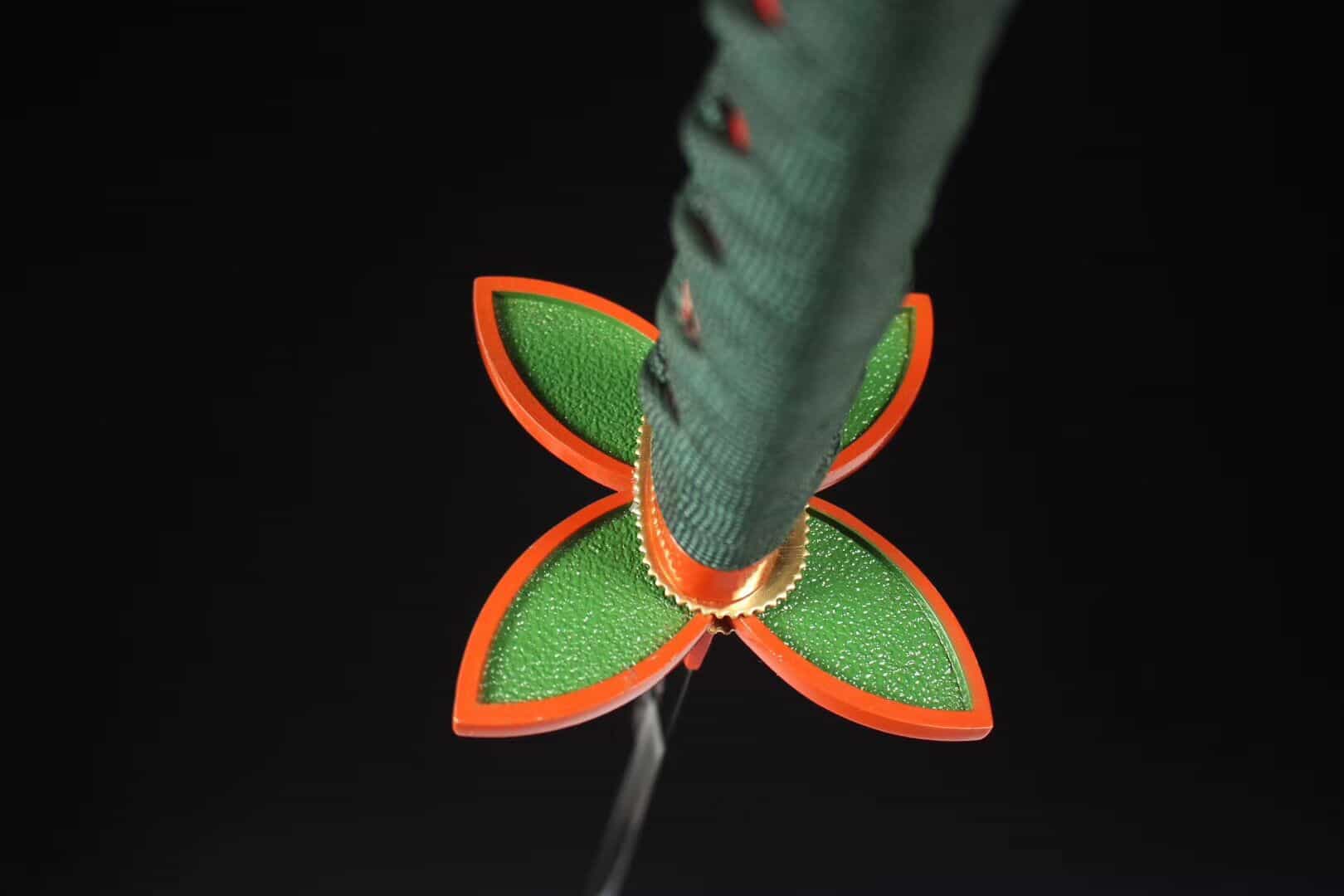 Shinobu’s nichirin sword is a katana made with a dark green ITO wrapped around an orange rayskin. The tsuba represents a flower with 4 petals and the blade is a long and black to remind the dart of an insect. The saya has the same color theme as the tsuka.
